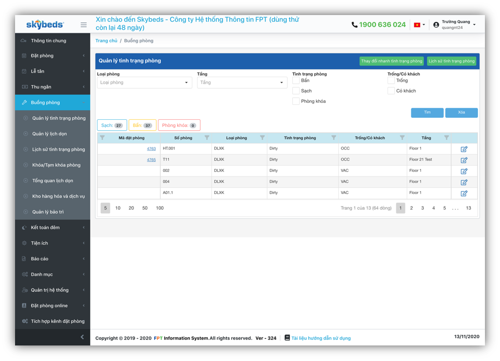 • Quản lý dịch vụ dọn phòng (House Keeping – HKP).